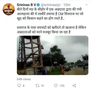 वीडियो शेयर करते हुए श्रीनिवास ने लिखा कि- ‘बीते दिनों मप्र के सीहोर में एक अन्नदाता द्वारा की गयी आत्महत्या की ये तस्वीरें तमाचा है CM शिवराज पर जो खुद को किसान कहने का ढोंग रचते है.. शवराज के पास जयचंदों को खरीदने तो खजाना है लेकिन अन्नदाताओं को मरने मजबूर किया जा रहा है’ वहीं श्रीनिवास के इस ट्वीट पर मध्यप्रदेश के प्रभारी भैयाजी पंवार ने रिप्लाई करते हुए लिखा कि- ‘शर्म करो ‘शव-राज’ तुम्हारे जयचंदों की मौज है, अन्नदाता मरते रोज है ।’