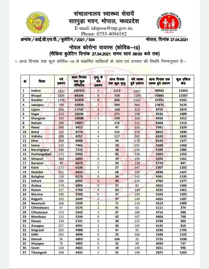 एमपी कोरोना रिपोर्ट 27 अप्रैल, 2021