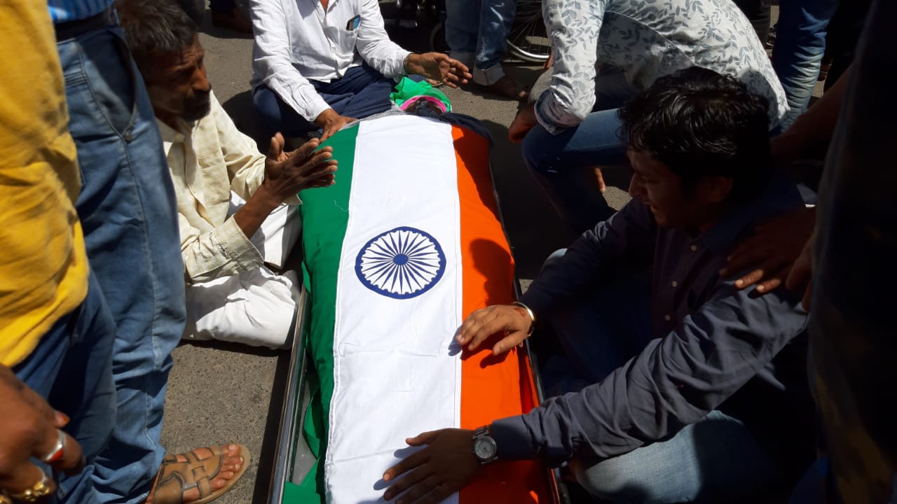 मंदसौर। सर्राफा कारोबारी अनिल सोनी की हत्या के मामले में गुरूवार को बड़ा बवाल हो गया। पोस्टमार्टम के बाद शव लेकर परिजन गांधी नगर चौराहे पर जमा हो गए। शव को बकायदा तिरंगे से लिपटा गया। जबकि यह सारी कार्रवाई बिना अनुमति की गई। अब अफसर अपनी जान बचा रहे हैं।