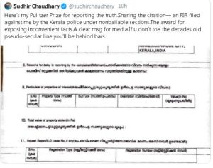 चौधरी ने खुद एफआईआर ट्वीट की, जिसमें उन्होंने पुलिस पर व्यंग्य करते हुए कहा, “असुविधाजनक तथ्यों को उजागर करने का पुरस्कार। मीडिया के लिए एक स्पष्ट संदेश। यदि आप दशकों पुरानी छद्म धर्मनिरपेक्ष लाइन को नहीं छोड़ते हैं तो आप सलाखों के पीछे रहेंगे।