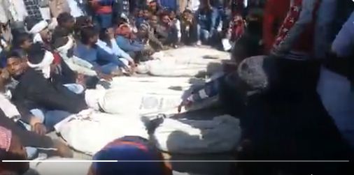 मृतकों के परिजन ने सड़क पर शव रखकर लगाया जाम, भारी पुलिस बल तैनात