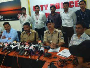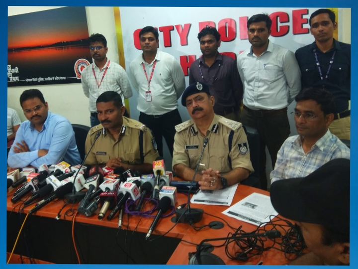पत्रकारों को गिरोह के संबंध में जानकारी देते हुए पुलिस कमिश्नर हरिनारायण चारी मिश्र —बाएं से दूसरे स्थान पर—, अतिरिक्त पुलिस उपायुक्त अनुराग शर्मा —बाएं से तीसरे स्थान पर—, डीसीपी क्राइम ब्रांच श्रुतकीर्ति सोमवंशी बाएं तरफ पहले स्थान पर और क्राइम ब्रांच एडीसीपी शैलेंद्र सिंह चौहान —दाहिनी तरफ से पहले स्थान पर—।