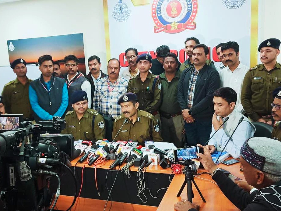 पत्रकारों को जानकारी देने आए भोपाल पुलिस कमिश्नर हरिनारायण चारी मिश्र मध्य में। पुलिस कमिशनर के दाहिनी तरफ डीसीपी क्राइम श्रुतकीर्ति सोमवंशी, बाएं तरफ एडीसीपी शैलेंद्र सिंह चौहान। पीछे रैकेट के भंड़ाफोड़ में शामिल क्राइम ब्रांच की टीम। चित्र भोपाल पुलिस की तरफ से जारी।