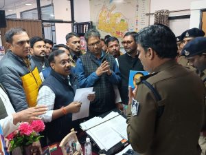 थाने के भीतर ज्ञापन देने पहुंचे कांग्रेस नेताओं का समूह जो एसीपी टीटी नगर चंद्रशेखर पांडे को विषय बताते हुए।
