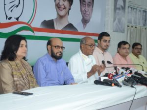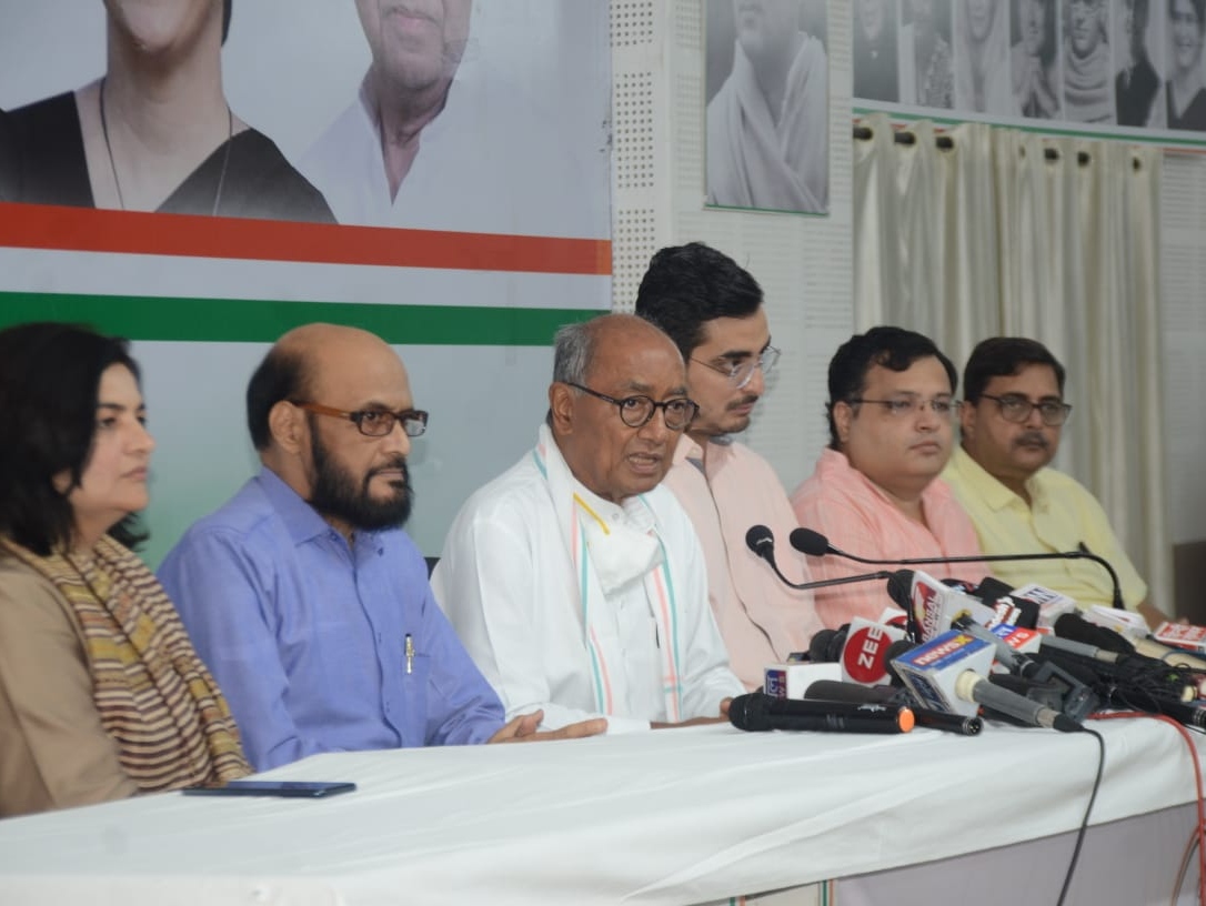 पूर्व मुख्यमंत्री दिग्विजय सिंह पत्रकारवार्ता को संबोधित करते हुए। चित्र कांग्रेस मुख्यालय से जारी किया गया।