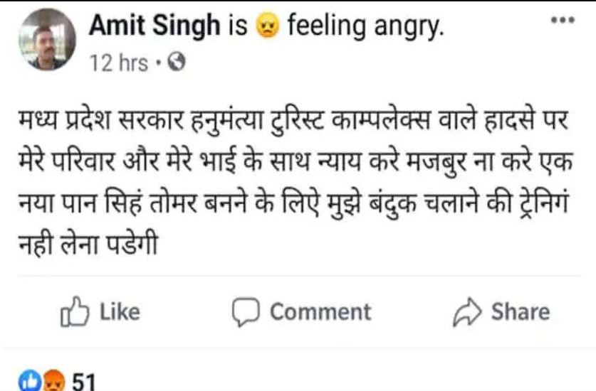 जवान अमित सिंह ने फेसबुक पर लिखा कि— मध्य प्रदेश सरकार हनुवंत्या टूरिस्ट काम्पलेक्स वाले हादसे पर मेरे परिवार और मेरे भाई के साथ न्याय करें। मजबूर न करे एक नया पान सिंह तोमर बनने के लिए, मुझे बंदूक चलाने की ट्रेनिंग नहीं लेनी पड़ेगी।