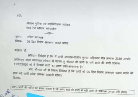भोपाल। (Bhopal) राजधानी में पदस्थ एक सिपाही (Constable) ने डीआईजी (DIG Bhopal) के नाम अनोखा पत्र लिखा है। छुट्टी के लिए लिखे गए आवेदन पत्र अजीबो-गरीब वजह बताई गई है। आवेदक ने बताया कि 11 दिसंबर 2020 को उसके सगे साले की शादी है। जिसमें शामिल होना अति आवश्यक है। लिहाजा 5 दिन का विशेष अवकाश प्रदान किया जाए। मजे की बात ये है कि पत्र के नीचे एक नोट भी लिखा गया है। जो इस प्रकार है ‘प्रार्थी की पत्नी का स्पष्ट कहना है कि अगर भाई की शादी में नहीं आए तो परिणाम अच्छा नहीं होगा।’ नोट में लिखी गई लाइन के जरिए प्रार्थी ने बताना चाहा है कि वो कितना मजबूर है और शादी में जाना कितना जरूरी है।