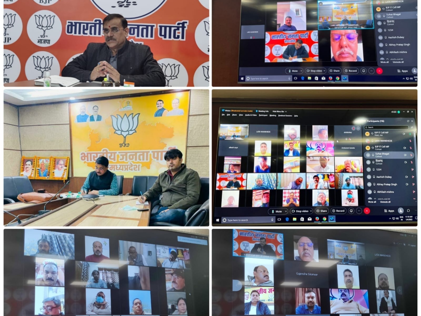 पोलिंग बूथ विस्तार योजना के कार्यक्रम की जानकारी देते भाजपा संगठन के पदाधिकारी। भोपाल भाजपा मुख्यालय से जारी चित्र।