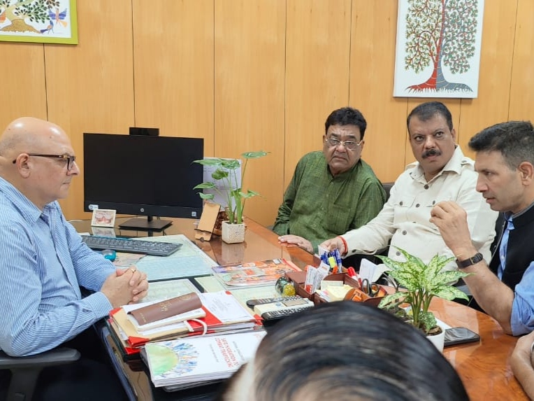 डीजीपी सुधीर कुमार सक्सेना के ओएसडी और डीआईजी विनीत कपूर से चर्चा करते हुए उमंग सिंघार और जीतू पटवारी। तस्वीर प्रदेश कांग्रेस कार्यालय की तरफ से जारी।