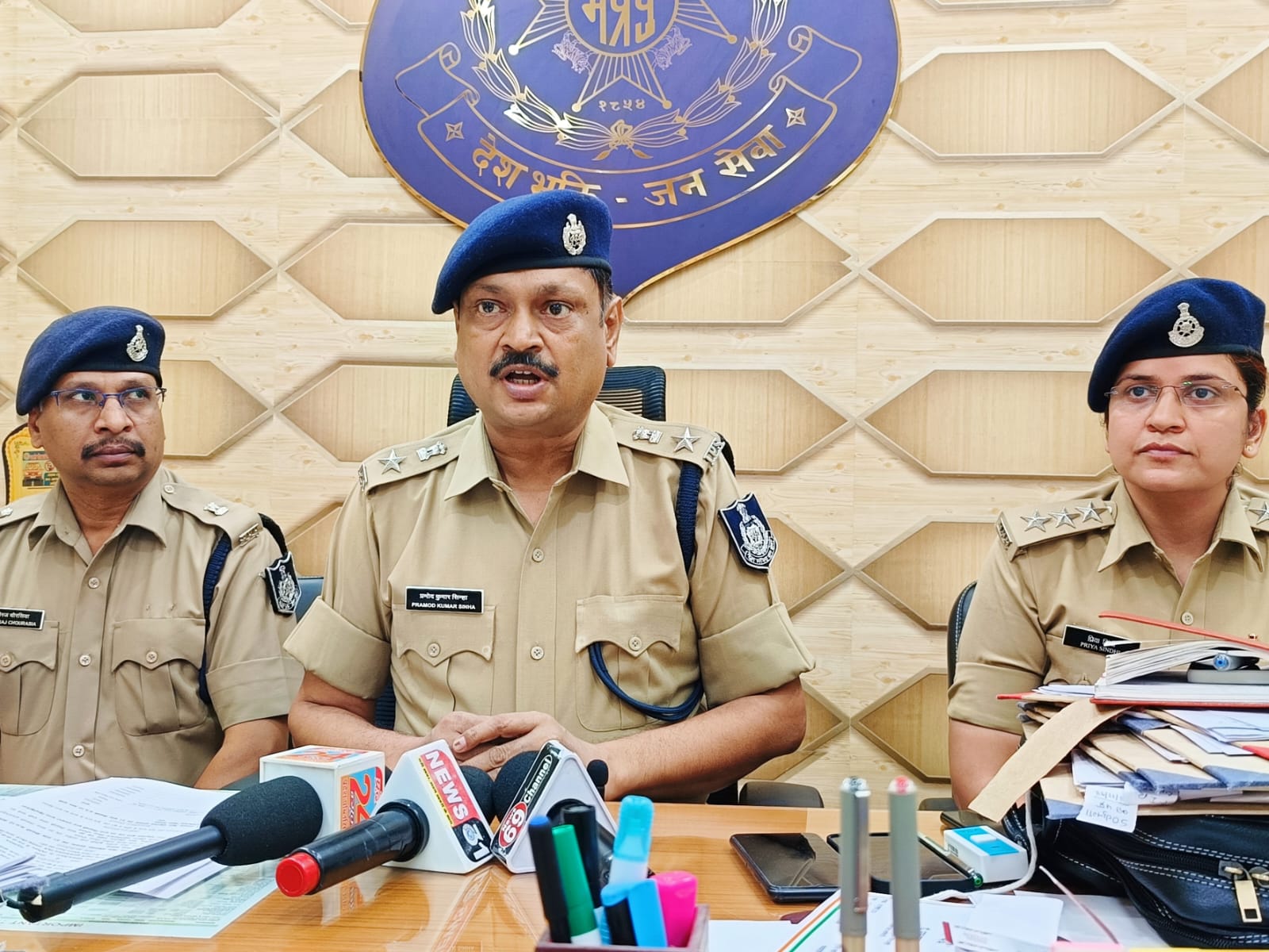 पत्रकारों को जानकारी देते हुए बीच में एसपी भोपाल देहात प्रमोद कुमार सिन्हा, दाहिनी तरफ एएसपी नीरज चौरसिया, बायी तरफ एसडीओपी बिलखिरिया प्रिया सिंधी।