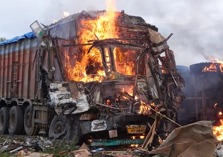 सिवनी। मध्यप्रदेश के सिवनी (Seoni) जिले गुरुवार तड़के भीषण सड़क हादसा हो गया। दो ट्रकों के बीच हुई आमने-सामने की टक्कर हो गई। भिड़ंत इतनी जोरदार थी कि ट्रकों के टकराते ही उनमें आग लग गई (Seoni Truck Accident)। आग में दोनों ट्रकों के ड्राइवर जिंदा जल गए। जानकारी के मुताबिक ट्रकों के क्लीनरों ने कूदकर जान बचाई। घटना में क्लीनर घायल हुए है। जब तक आग बुझाई गई तब तक दोनों ट्रक ड्राइवर की भीषण आग में जल गए। तीन घायलों को इलाज के लिए जिला अस्पताल भेजा गया है। पुलिस ने हादसे की जांच शुरु कर दी है।