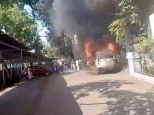 भोपाल कलेक्टर कार्यालय के मेन गेट के बाहर धूं—धूं करती स्कॉर्पियो। यहां लोगों ने भागकर अपनी जान बचाई। फायर ब्रिगेड पहुंची तब तक पूरी जल चुकी थी कार। कलेक्टर कार्यालय में नहीं थे फायर एम्युनिशेन। बोले कौन लिखे कौन, समाचार पर सरकार हरकत नहीं चुप हो जाती है। सोशल मीडिया में वायरल वीडियो से लिया गया चित्र।