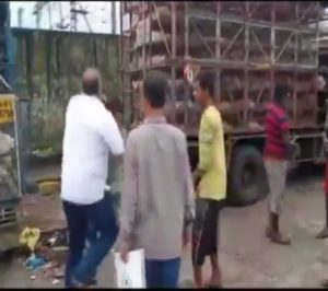 #WATCH Mumbai: Shiv Sena Corporator Milind Vaidya assaulted chicken traders near Machimar Colony in Mahim, over chicken carriers' vehicles being parked in Mahim area near railway station. (Note: Strong language) pic.twitter.com/Dqd2aZOSmN