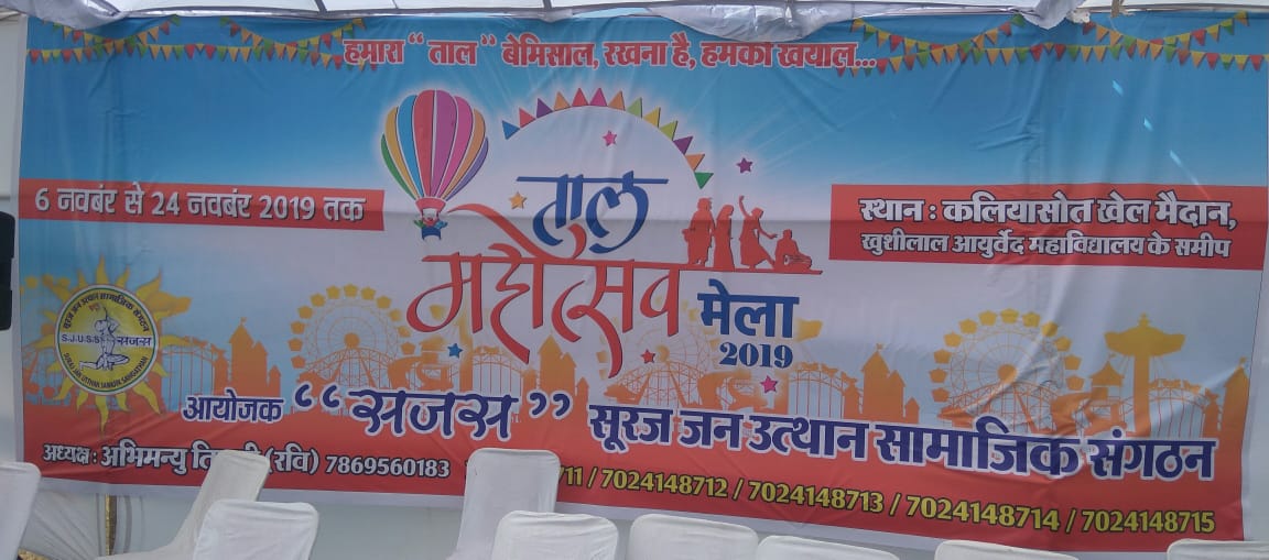 भोपाल। झीलों की नगरी भोपाल (Bhopal) में अब तक का सबसे बड़ा मेला लगने जा रहे है। कलियासोत डैम (Kaliyasot Dam) के पास खेल मैदान में लग रहे ताल महोत्सव मेला 2019 (Taal Mahotsav Mela 2019) की शुरुआत देश के जाने-माने कवि कुमार विश्वास (Kumar Vishwas) की प्रस्तुति के साथ होगी। तालाबों को बचाने की मुहीम के तहत आयोजित हो रहे इस मेले में रंगारंग कार्यक्रम होंगे। कलियासोत डैम में वाटर स्पोर्ट्स (Water Sport’s) के साथ तमाम स्पोर्ट्स एक्टिविटी भी होंगी। ताल महोत्सव मेले का आयोजन सूरज जन उत्थान सामाजिक संगठन ‘सजस’ कर रहा है। मध्यप्रदेश कांग्रेस उपाध्यक्ष एवं समाजसेवी सूरज तिवारी (Suraj Tiwari) महोत्सव संयोजक हैं।