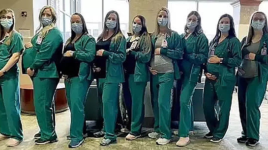 वाशिंगटन। आप यकीन नहीं करेंगे लेकिन यह घटना बिलकुल सही है। अमेरिका में एक निजी अस्पताल की 10 नर्स और एक महिला डॉक्टर एक साथ गर्भवती हो गई। जिसके बाद अस्पताल में एक अफवाह फैल गई। अफवाह यह थी कि वहां के पानी में ही कोई कमी है। जिस कारण ऐसा वाक्या हुआ। इस कारण लोग अपने घरों से पानी लेकर आने लगे। लेकिन, जब सभी गर्भवती नर्स और डॉक्टर की तस्वीर एक साथ दुनिया (World News) के सामने आई तोा यह रोचक मामला हो गया। इतना ही नहीं वे एक साथ इस वक्त निजी अस्पताल में सेवाएं भी दे रही हैं। इनमें से दो नर्स की प्रसव की तारीख एक ही है। यह समाचार विदेशों में बहुत ज्यादा धूम मचा रहा है। इन नर्स की वजह से अस्पताल भी इन दिनों सुर्खियों में हैं।