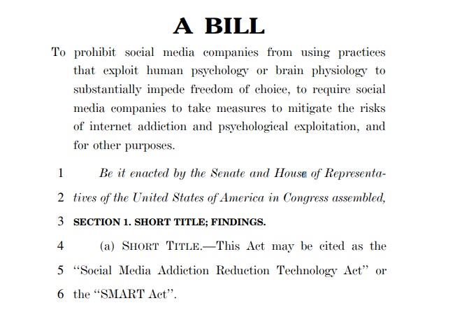 रिपब्लिकन सीनेटर जोश हॉले ने बीते मंगलवार को “सोशल मीडिया की लत” के खिलाफ अमरीकी संसद में एक नया बिल (SMART ACT)  पेश किया है। इसे वैश्विक अर्थव्यवस्था में सिलिकॉन वैली के बढ़ते दबदबे पर लगाम कसने की रणनीति के तौर पर देखा जा रहा है। इस विधेयक का नाम सोशल मीडिया एडिक्शन रिडक्शन टेक्नोलॉजी एक्ट (स्मार्ट एक्ट SMART ACT) है। इस विधेयक के जरिये सोशल मीडिया कंपनियों की अपने यूजर को ज्यादा से ज्यादा अपने फोरम का उपयोग करने के लिए किए जाने वाले गैरजरूरी प्रयासों पर लगाम लगाने की कोशिश की जा रही है। जैसे कि YouTube के “ऑटोप्ले” फीचर या स्नैपचैट के “स्नैपस्ट्रेक्स” पर इस बिल के बाद लगाम लग जाएगी।
